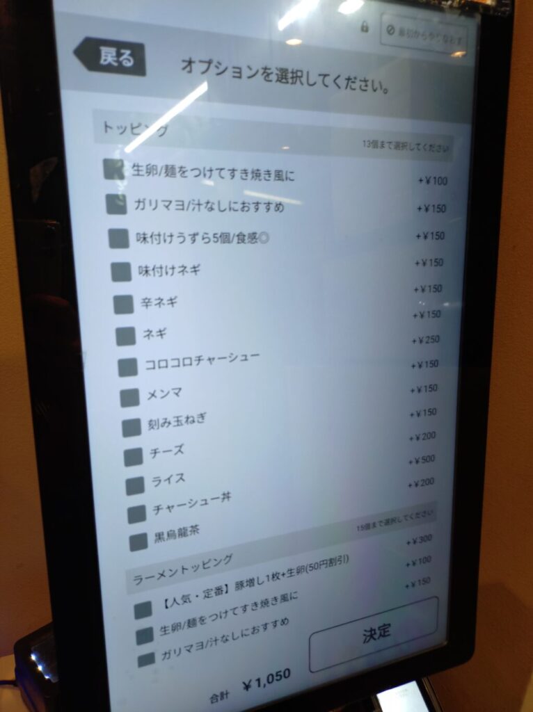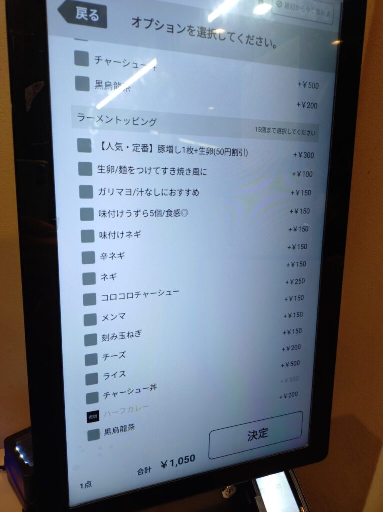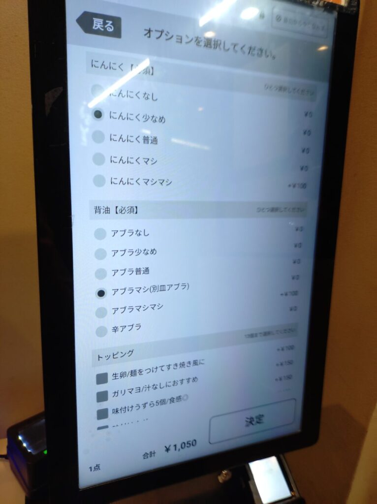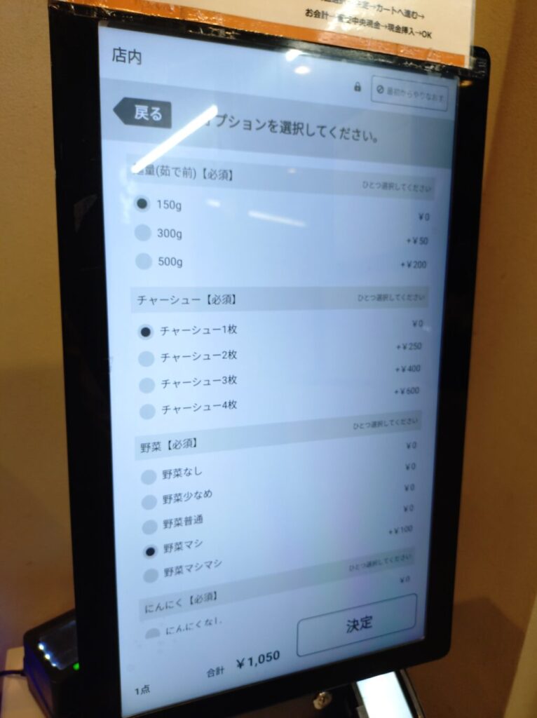 麺量は「小(150g)」「通常(300g)+50円」「大(500g)+200円」などで選べるようになっています。
