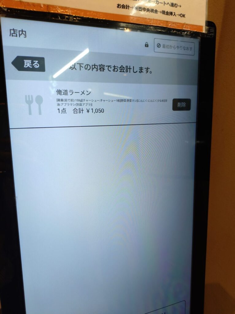 今回は、「俺道ラーメン 1,050円」で、麺の増量なしの150g(茹で前)。