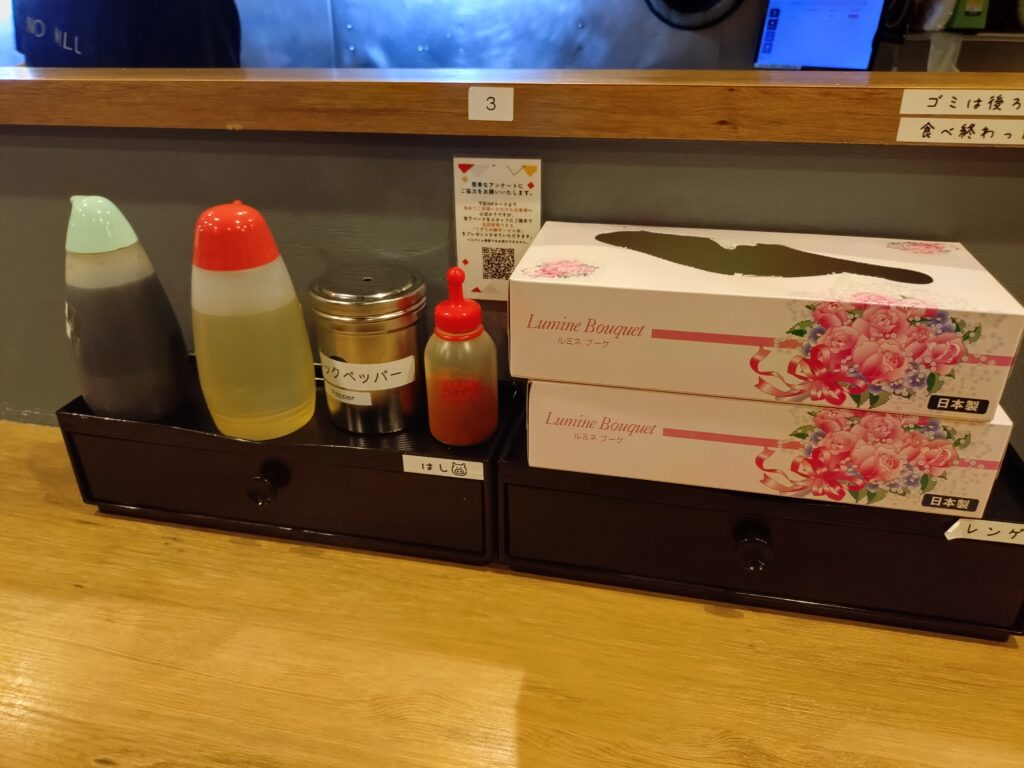 卓上には、醤油、お酢、ブラックペッパー、唐辛子、はし、レンゲ、ティッシュなどがあります。