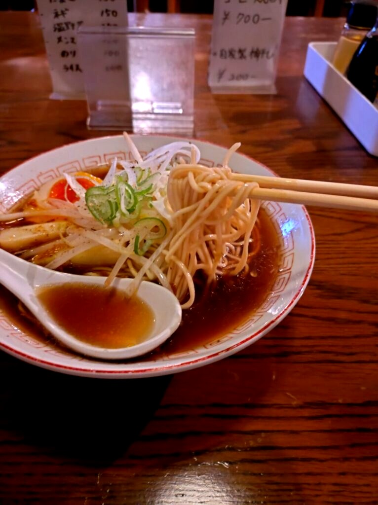 持ち上げてみると、麺は細め〜中細くらいのストレート麺。スープが程よく絡む感じで出汁の香りを運びやすくなっています。噛むと適度な弾力がありながらも、喉越しがスムーズ。飲酒後でも重く感じない軽さ食べやすいです。