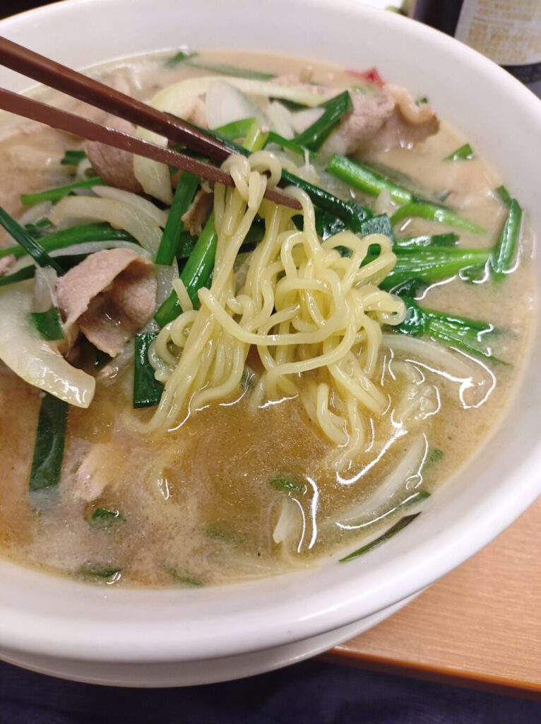 スープを一口に運ぶと、まず香ばしいコクが舌に広がり、続いて豚バラの甘み、ニラの青い風味が後から追いかけてきます。